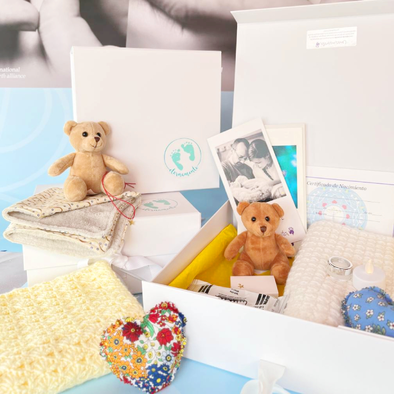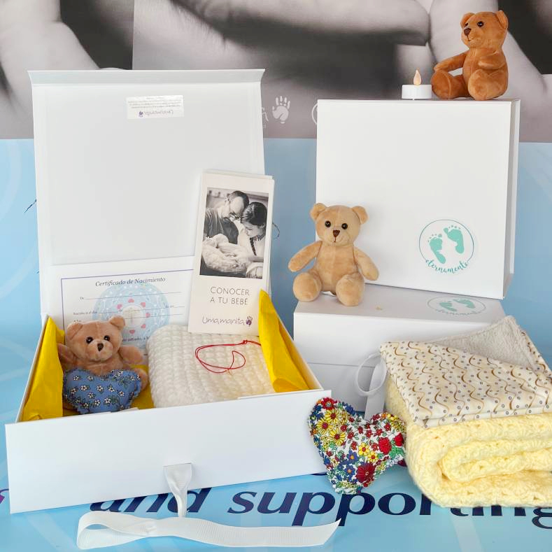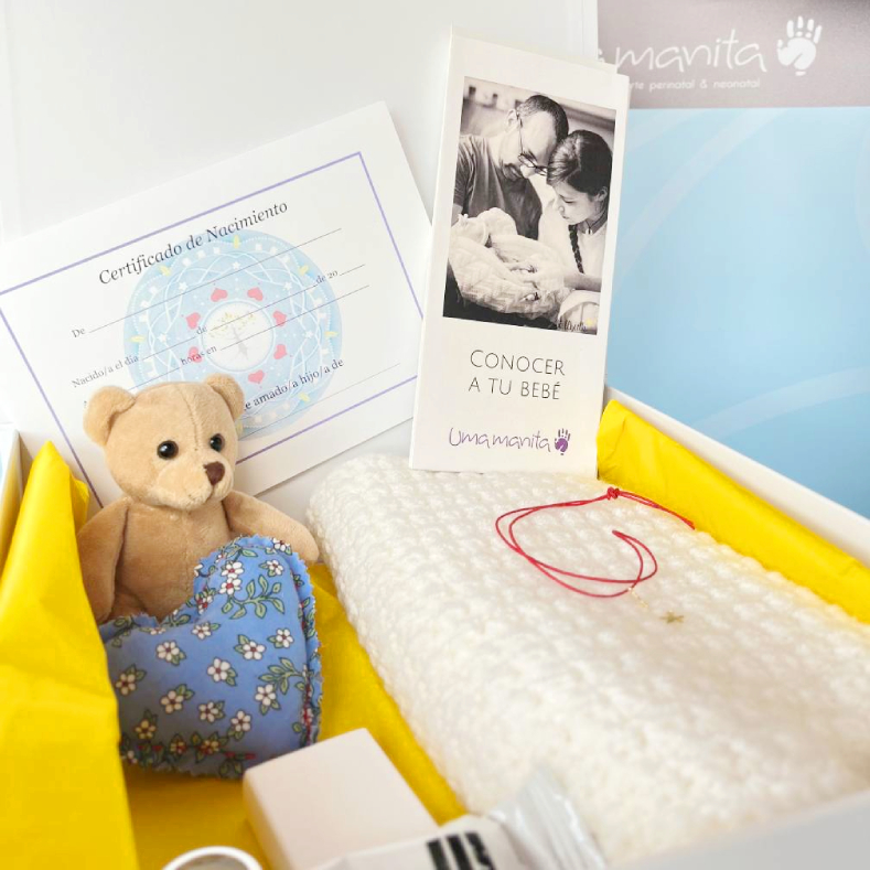 Para ayudar a fomentar la práctica de ofrecer objetos de recuerdo y fotografías a madres y padres en los hospitales españoles, en Umamanita hemos creado nuestras propias cajas de recuerdos, compuestas de objetos, recursos y folletos informativos.