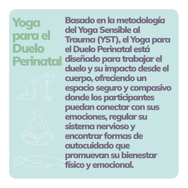 Basado en la metodología del Yoga Sensible al Trauma (YST), el Yoga para el Duelo Perinatal se presenta como una intervención semanal online (mediante Zoom) para abordar las necesidades de personas en duelo que dura un total de 8 semanas.