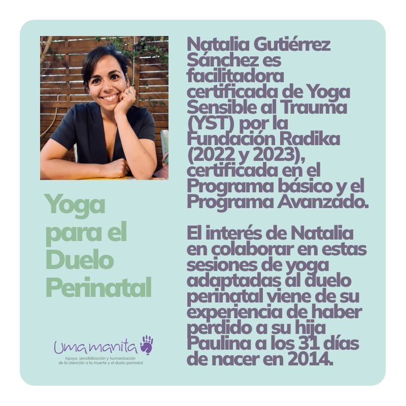 Natalia Gutiérrez Sánchez es practicante de yoga desde hace más de 10 años. En 2023 se certificó como profesora de Hata Yoga (YTT 200 hrs) por El Gong Club de Yoga y ha cursado múltiples talleres con diferentes profesoras y profesores de todo el mundo, lo que le ha permitido enriquecer su práctica y su forma de compartir. Natalia es facilitadora certificada de Yoga Sensible al Trauma (YST) por la Fundación Radika (2022 y 2023), certificada en el Programa básico y el Programa Avanzado. En la actualidad es mentora en el Programa de YST básico de 2025. El interés de Natalia en colaborar de forma voluntaria en el desarrollo de estas sesiones de yoga adaptadas a las necesidades de personas en situación de duelo perinatal viene de su experiencia personal de haber perdido a su hija Paulina a los 31 días de nacer en 2014.